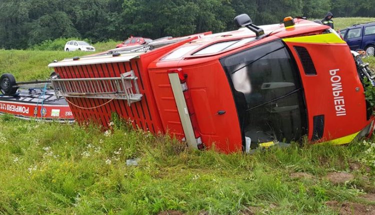 Distanța este prea mică, iar viteza mașinii ce a derapat mare…. Impactul frontal este evitat dar nu și accidentul. Mașina de pompieri se răstoarnă în partea dreaptă a drumului.