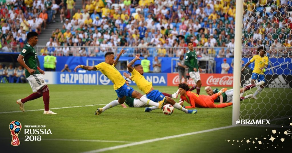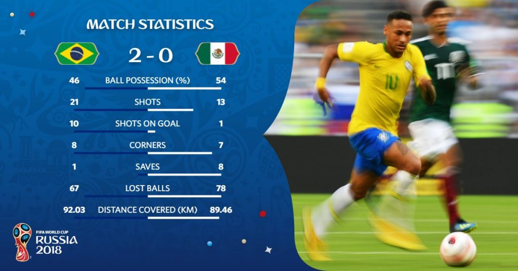 Cvintupla campioană mondială, deşi a fost stânjenită de jocul făcut de ”El Tri”, a avut oportunităţi destul de bune, prin Neymar (5), cu un şut de la distanţă apărat de Ochoa, care a blocat vedeta braziliană şi în min. 25. Gabriel Jesus (26) a fost oprit de Ayala, Coutinho (27) a şutat peste poartă, dar cea mai bună situaţie a fost irosită de acelaşi Gabriel Jesus (33), al cărui şut din unghi a fost respins de Ochoa. Neymar (40) a mai avut o situaţie notabilă, dar a şutat peste poartă din lovitură liberă.