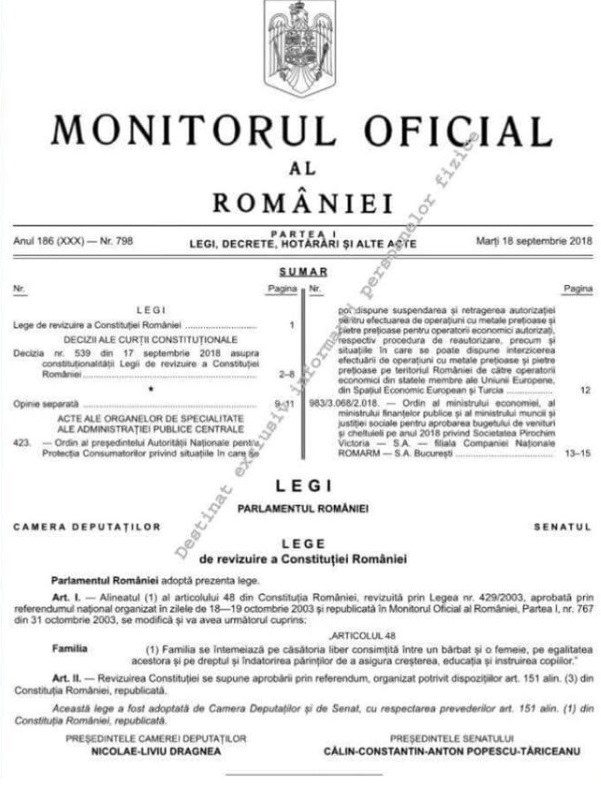 Legea de revizuire a Constituției României în forma aprobată de Parlament la care se va face referire pe buletinul de vot a fost publicată în Monitorul Oficial din data de 18 septembrie 2018 şi clarifică definiția Căsătoriei între un bărbat și o femeie la articolul 48, aliniatul 1 al Constituției.