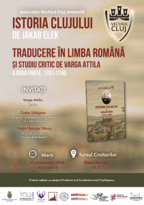 Traducerea lucrării „Istoria Clujului” scrisă de Jakab Elek este un proiect monumental, pe care Varga Attila, cercetător științific la Institutul de Istorie „George Barițiu” al Academiei Române, împreună cu Asociația Vechiul Cluj și l-au asumat ca un proiect multianual. Al doilea volum cuprinde și un studiu introductiv, pe lângă traducerea care acoperă perioada dintre anii 1701 și 1740, ambele realizare de Varga Attila. Reamintim faptul că lucrarea originală se întinde pe trei volume a câte 1.000 pagini, a apărut între anii 1870 și 1888 și acoperă o perioadă foarte lungă de timp din istoria Clujului, din cele mai vechi timpuri până în secolul al XIX-lea. Lansarea celui de-al doilea volum al primei serii a traducerii are loc cu începere de la ora 19:00, la etajul I al Turnului Croitorilor.