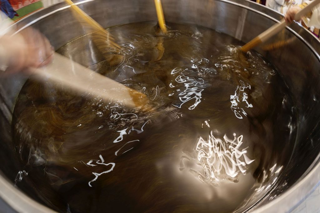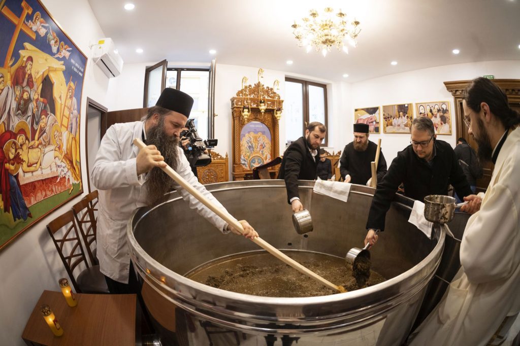 „Pe fundul cazanului s-a turnat o cantitate de vin pentru ca preparatul să nu se prindă în timpul fierberii. Sunt patru persoane care amestecă în continuu”, a adăugat ierarhul.
