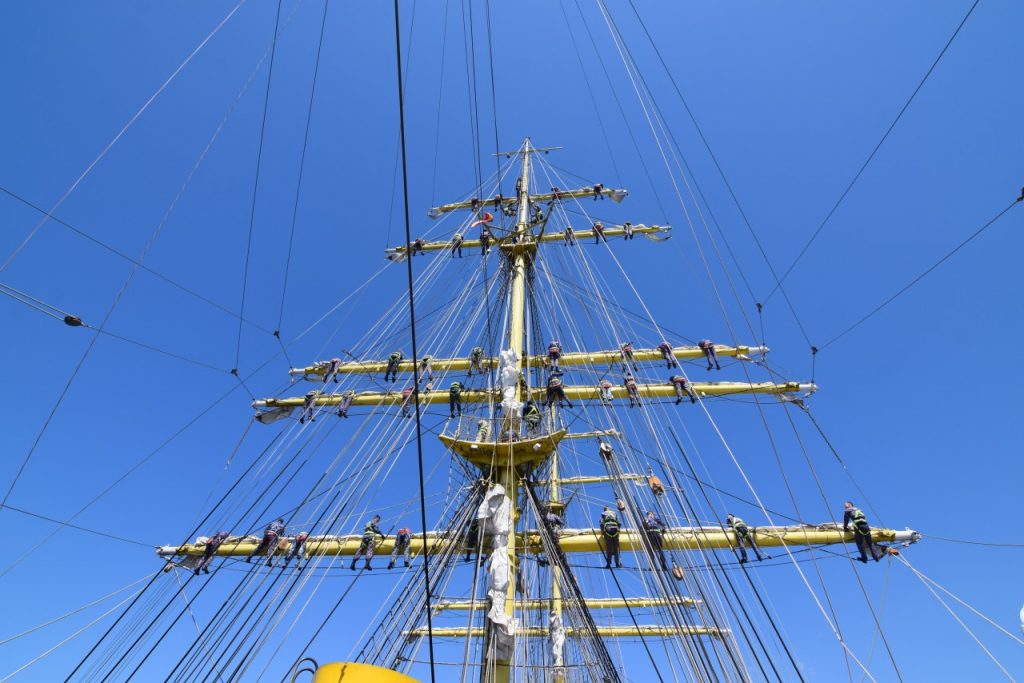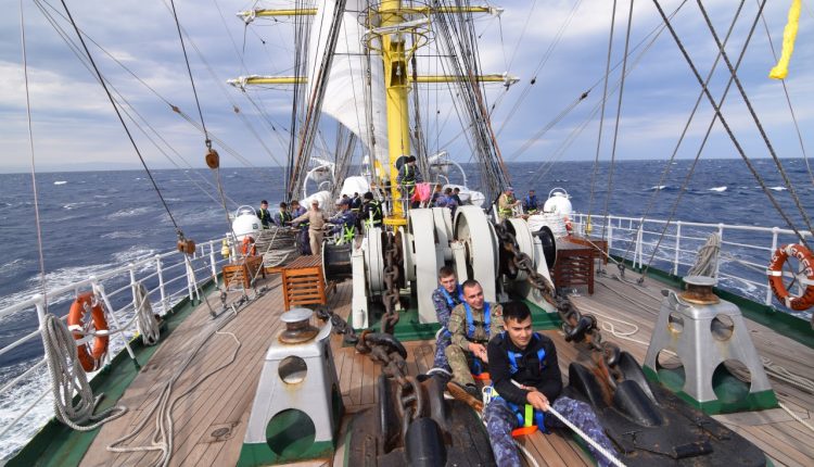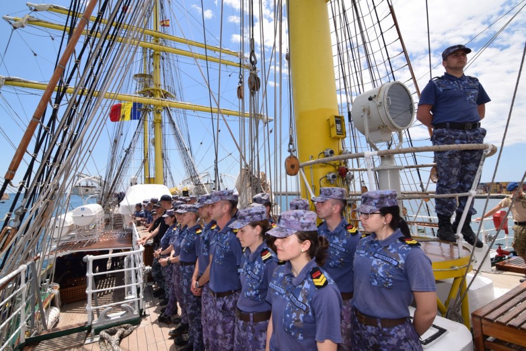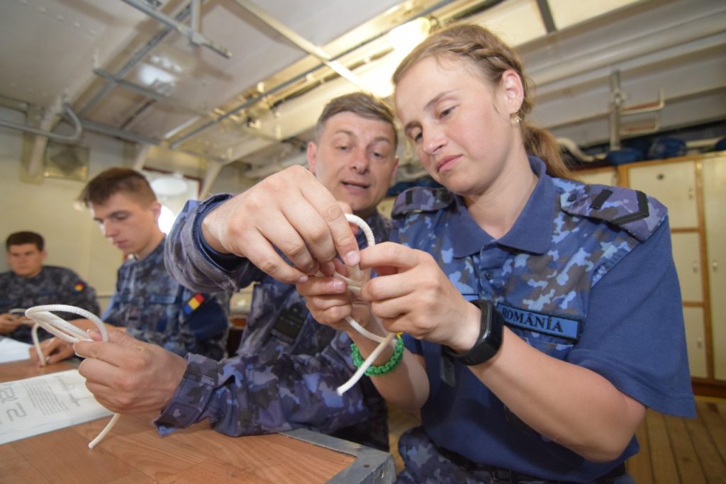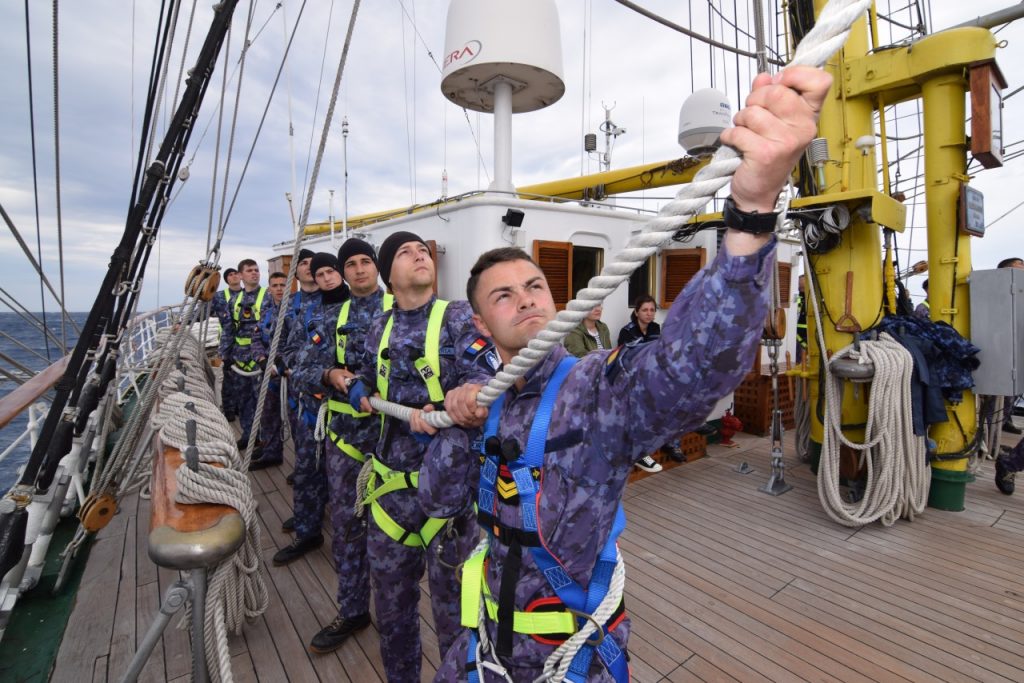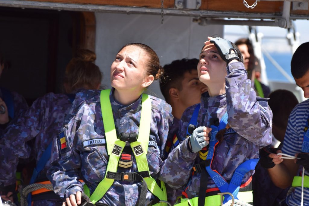 „La ora 16:00 domnul comandant a ordonat întinderea velelor triunghiulare, iar noi ne-am conformat. Împreună cu maiștri velari și soldați din cadrul Serviciului de Luptă Manevra Velelor, am început să întindem velele triunghiulare individual, pe faruri. (…) Întinderea a durat aproximativ o oră și de la ora 17:00 până la ora 20:00, am navigat cu vele, exclusiv doar cu velele triunghiulare. Ca o viteză medie, am prins undeva la 7 noduri. Imediat după masa de seară, pentru că vântul începuse să cadă, s-a ordonat strângerea velelor triunghiulare. Am început cu straiul randă, pentru că acela era cel mai aproape de motor, iar motorul trebuia să fie deja gata în acțiune”, ne dezvăluie Aspirant Laura Zburlea, Comandantul Serviciului de Luptă Manevra Velelor.