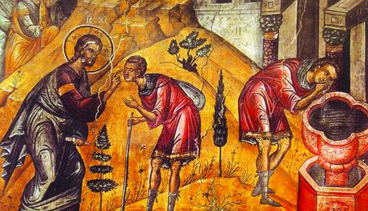 Acestea zicând, a scuipat jos şi a făcut tină din scuipat şi a uns cu tină ochii orbului. Apoi i-a zis: Mergi de te spală în scăldătoarea Siloamului, care se tâlcuieşte: trimis. Deci s-a dus şi s-a spălat şi a venit văzând. Iar vecinii şi cei ce-l văzuseră mai înainte că era orb ziceau: Nu este acesta cel ce şedea şi cerşea? Unii ziceau: El este.