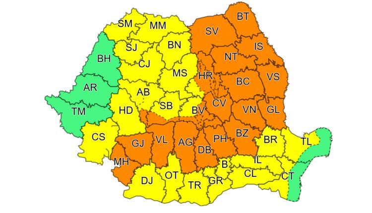 Judeţele vizate de avertizarea Cod portocaliu sunt: Botoşani, Iaşi, Vaslui, Galaţi, Vrancea, Bacău, Neamţ, Suceava, Buzău, Prahova, Covasna, Dâmboviţa, Argeş, Vâlcea, Gorj, Mehedinţi şi, parţial, Braşov, Sibiu, Alba şi Harghita.