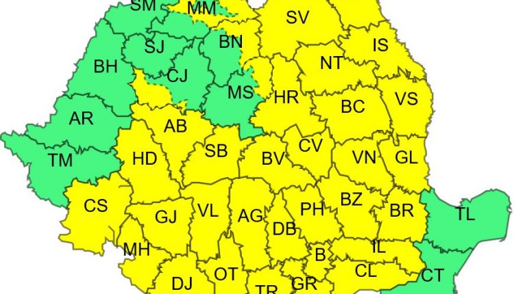 Judeţele vizate de atenţionarea Cod galben sunt: Botoşani, Iaşi, Vaslui, Galaţi, Brăila, Ialomiţa, Călăraşi, Giurgiu, Buzău, Vrancea, Bacău, Neamţ, Suceava, Harghita, Covasna, Braşov, Prahova, Dâmboviţa, Argeş, Teleorman, Olt, Vâlcea, Gorj, Dolj, Mehedinţi, Caraş-Severin, Hunedoara, Alba, Sibiu, Bucureşti, Ilfov, respectiv parţial în judeţele Maramureş, Bistriţa-Năsăud, Mureş şi Cluj.