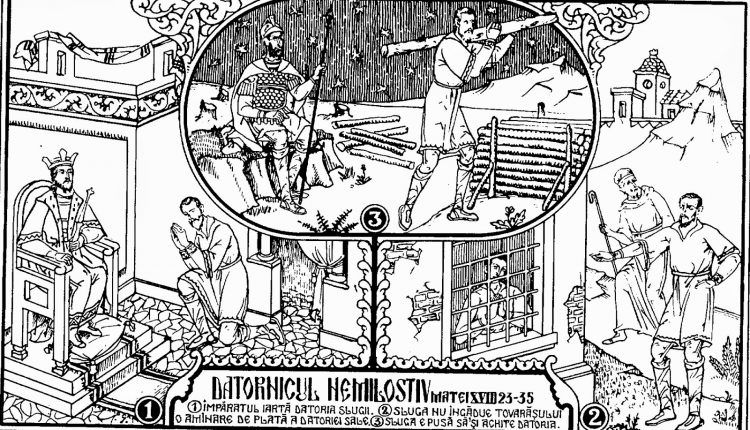 Deci, căzând cel ce era slugă ca și el, îl ruga zicând: Mai îngăduieşte-mă şi îţi voi plăti! Iar el nu voia, ci, mergând, l-a aruncat în închisoare până ce va plăti datoria. Iar celelalte slugi, văzând cele petrecute, s-au întristat foarte mult şi, venind, au spus stăpânului toate cele întâmplate. Atunci, chemându-l stăpânul său îi zise: Slugă vicleană, toată datoria aceea ţi-am iertat-o, fiindcă m-ai rugat. Nu se cădea, oare, ca și tu să ai milă de cel împreună slugă cu tine, precum şi eu am avut milă de tine? Şi, mâniindu-se stăpânul lui, l-a dat pe mâna chinuitorilor până ce-i va plăti toată datoria. Tot aşa şi Tatăl Meu cel ceresc vă va face vouă, dacă fiecare dintre voi nu va ierta greșelile fratelui său, din toată inima.