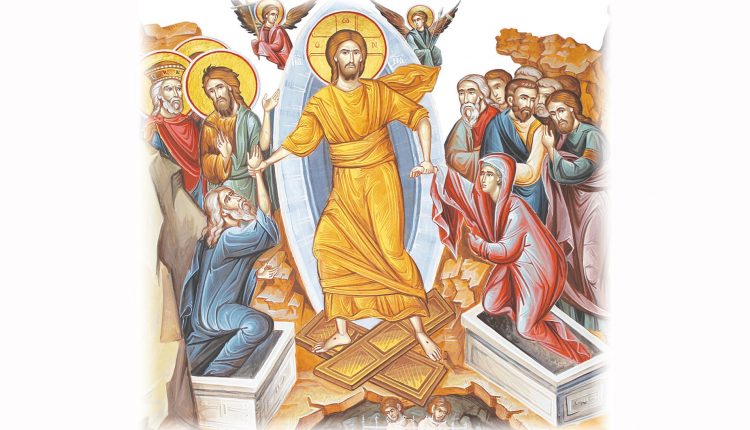 De asemenea, icoana ortodoxă a Învierii Domnului ne prezintă pe Mântuitorul Hristos coborând la iad cu sufletul Său îndumnezeit, sfărâmând porțile iadului, adică biruind întunericul însingurării prin lumina iubirii Sale, ridicând apoi din iad şi din moarte firea omenească reprezentată de strămoșii neamului omenesc, Adam şi Eva, dăruind totodată bucurie sufletelor drepților din Vechiul Testament, care așteptau mântuirea ca biruință a lui Hristos asupra păcatului, asupra iadului şi asupra morţii. Pe scurt, „pe Adam din stricăciune ridicând şi moartea pierzând”, cum se spune în Luminânda Sfintelor Paşti[4].