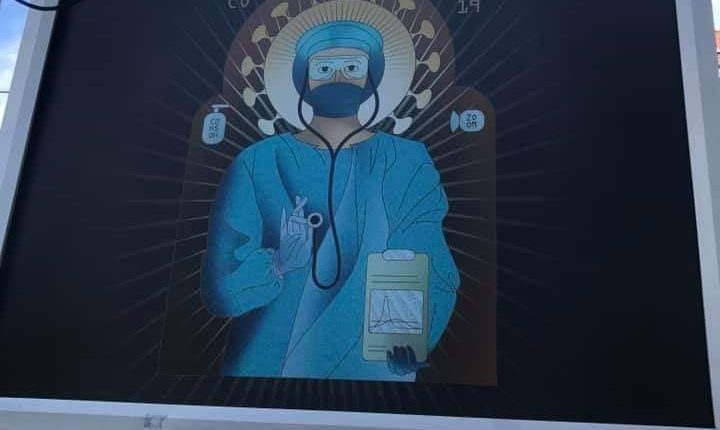 În unele reprezentări apare un personaj care poartă halat, bonetă, ochelari de protecție, stetoscop și mască. După modelul icoanelor ortodoxe Pantocrator, acesta binecuvântează cu mâna dreaptă, în timp ce în stânga ține o foaie de observație medicală. În altă imagine apare o asistentă medicală cu mai multe mâini, ca în reprezentările zeului Shiva, creatorul și distrugătorul universului în mitologia hindusă.