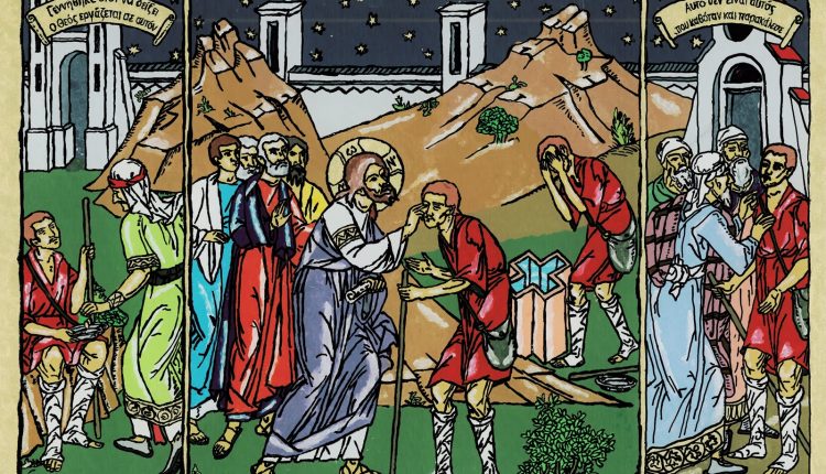 În vremea aceea, trecând Iisus, a văzut pe un om orb din naştere. Și ucenicii Lui L-au întrebat, zicând: Învăţătorule, cine a păcătuit, acesta sau părinţii lui, de s-a născut orb? Iisus a răspuns: Nici acesta n-a păcătuit, nici părinţii lui, ci ca să se arate în el lucrările lui Dumnezeu. Trebuie să fac, până este ziuă, lucrările Celui Care M-a trimis pe Mine; căci vine noaptea, când nimeni nu poate să lucreze. Atât cât sunt în lume, Eu sunt Lumina lumii. Acestea zicând, a scuipat jos şi a făcut tină din scuipat şi a uns cu tină ochii orbului. Apoi i-a zis: Mergi de te spală în scăldătoarea Siloamului, care se tâlcuieşte: trimis. Deci s-a dus şi s-a spălat şi a venit văzând. Iar vecinii şi cei ce-l văzuseră mai înainte că era orb ziceau: Nu este acesta cel ce şedea şi cerşea? Unii ziceau: El este. Alţii ziceau: Nu este el, ci seamănă cu el. Dar acela zicea: Eu sunt. Deci îi ziceau: Cum ți s-au deschis ochii? Acela a răspuns: Omul Care Se numeşte Iisus a făcut tină, a uns ochii mei și mi-a zis: Mergi la scăldătoarea Siloamului şi te spală. Deci, ducându-mă şi spălându-mă, am văzut. Zis-au lui: Unde este Acela? Și el a zis: Nu ştiu. L-au dus la farisei pe cel ce fusese oarecând orb. Şi era sâmbătă în ziua în care Iisus a făcut tină şi i-a deschis ochii. Deci, iarăși îl întrebau și fariseii cum a văzut. Iar el le-a zis: Tină a pus pe ochii mei şi m-am spălat şi văd. Însă unii dintre farisei ziceau: Acest Om nu este de la Dumnezeu, fiindcă nu ține sâmbăta. Iar alţii ziceau: Cum poate un om păcătos să facă asemenea minuni? Şi era dezbinare între ei. Au zis, deci, orbului iarăşi: Dar tu ce zici despre El, că ţi-a deschis ochii? Iar el a zis că Proroc este. Dar iudeii n-au crezut despre el că era orb şi a văzut, până ce n-au chemat pe părinţii celui ce vedea.