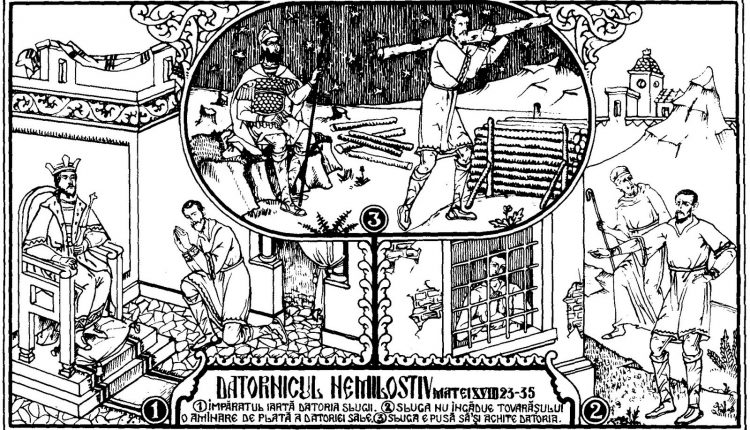 Dar, ieșind, sluga aceea a găsit pe unul dintre cei ce slujeau cu el și care-i datora o sută de dinari. Și, punând mâna pe el, îl sugruma, zicând: Plăteşte-mi ce eşti dator! Deci, căzând cel ce era slugă ca și el, îl ruga zicând: Mai îngăduieşte-mă şi îţi voi plăti! Iar el nu voia, ci, mergând, l-a aruncat în închisoare până ce va plăti datoria. Iar celelalte slugi, văzând cele petrecute, s-au întristat foarte mult şi, venind, au spus stăpânului toate cele întâmplate. Atunci, chemându-l stăpânul său îi zise: Slugă vicleană, toată datoria aceea ţi-am iertat-o, fiindcă m-ai rugat. Nu se cădea, oare, ca și tu să ai milă de cel împreună slugă cu tine, precum şi eu am avut milă de tine? Şi, mâniindu-se stăpânul lui, l-a dat pe mâna chinuitorilor până ce-i va plăti toată datoria. Tot aşa şi Tatăl Meu cel ceresc vă va face vouă, dacă fiecare dintre voi nu va ierta greșelile fratelui său, din toată inima.