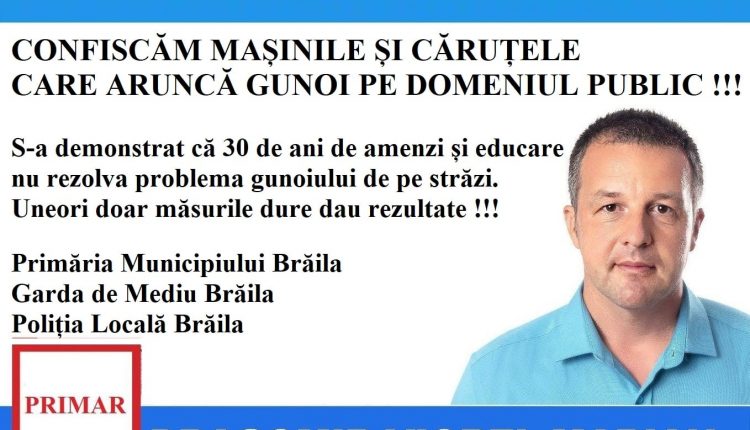 „A fost confiscată prima căruţă, iar proprietarul ei a fost amendat cu 30.000 lei (6.200 euro). A fost confiscată prima maşină, iar proprietarul ei a fost amendat cu 30.000 lei (6.200 euro). Continuăm, doar aşa terminăm cu gunoaiele. Gata, ajunge, dacă vrem un oraş curat, trebuie să luăm atitudine! Dacă cumva credeţi că aceşti indivizi au aruncat acum prima dată gunoiul pe câmp, nu este aşa, pe 05.02.2021 au mai fost prinşi şi amendaţi cu 1.000 de lei fiecare. Acum vor avea ce povesti la cei ca ei. Dacă cumva credeţi că nu vor plăti amenzile, nu este aşa. Vor fi executaţi silit (dacă au bunuri în proprietate sau venituri) sau daţi în judecată (dacă nu au bunuri în proprietate sau venituri), pentru ca amenzile să se transforme în ore de muncă în folosul comunităţii. Nu mai scapă niciodată”, a declarat primarul muncipiului Brăila, Marian Dragmori.