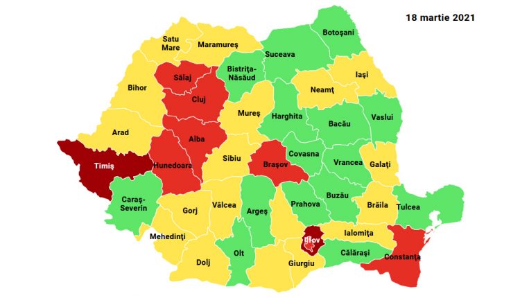 În scenariul roşu se mai află judeţele Timiş, cu o incidenţă de 5,90 cazuri de infectări cu SARS-CoV-2 la mia de locuitori, Ilfov – 5,79, Braşov – 4,42, Cluj – 3,97, Hunedoara – 3,46, Constanţa – 3,36, Alba – 3,21, Sălaj – 3,05.