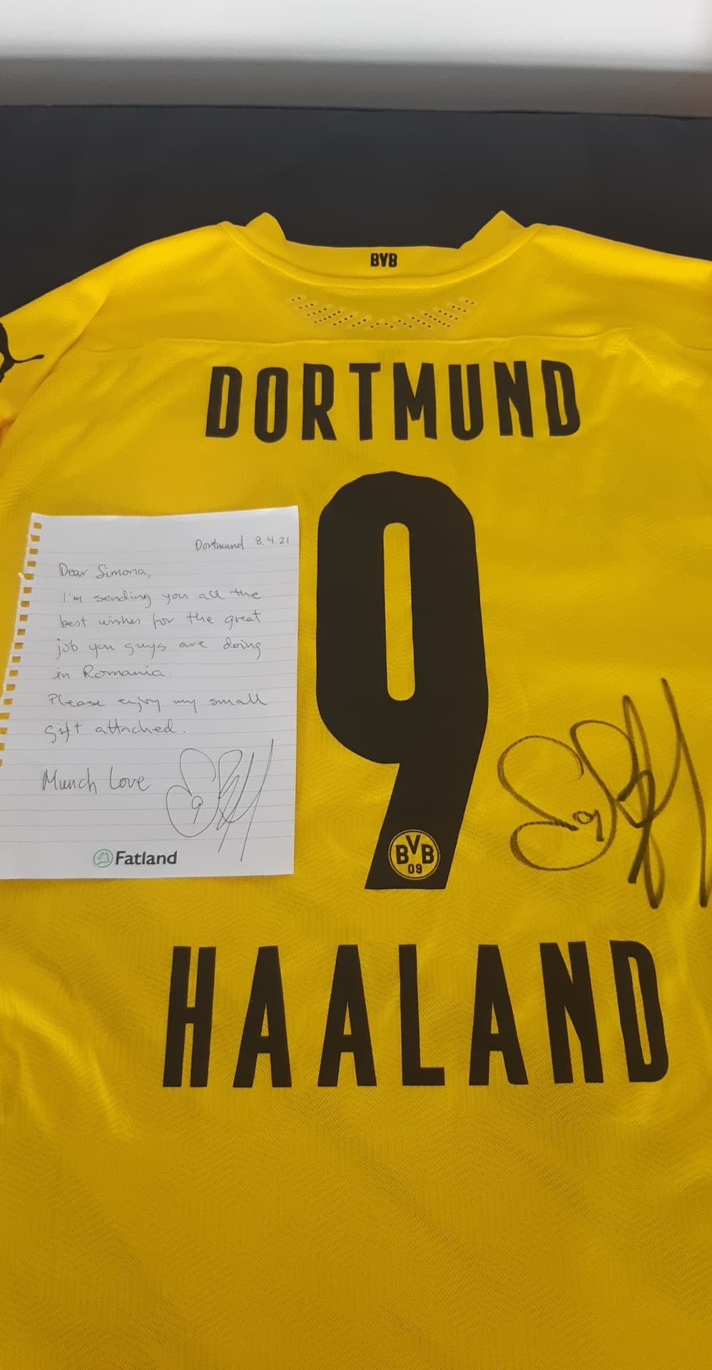 „Un colet surpriză a ajuns azi la sediul nostru! Coletul este din partea renumitului fotbalist al echipei Borussia Dortmund, Erling Haaland și conține tricoul personal al marelui fotbalist cu semnătura lui, poze cu autograful său și o scrisoare adresată președintei Simona Zlibuț. Cuvintele de mulțumire sunt modeste pentru recunoștința ce o avem față de gestul nobil al acestui sportiv. Vă mulțumim!”, au scris reprezentanții fundației susținute și de arbitrul Octavian Șovre.