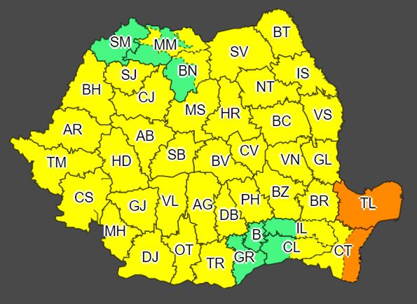 Administraţia Naţională de Meteorologie (ANM) a emis, luni, o avertizare Cod galben de ploi însemnate cantitativ şi instabilitate atmosferică temporar accentuată, valabilă până marţi seara, în aproape toată ţara, şi un Cod portocaliu de ploi abundente ce vizează zona Litoralului.
