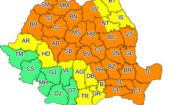 Judeţele aflate vineri sub Cod portocaliu şi Cod galben, unele total şi altele parţial, sunt: Alba, Argeş, Arad, Bacău, Bihor, Bistriţa-Năsăud, Brăila, Botoşani, Braşov, Buzău, Cluj, Călăraşi, Constanţa, Covasna, Dâmboviţa, Galaţi, Giurgiu, Hunedoara, Harghita, Ialomiţa, Iaşi, Maramureş, Mureş, Neamţ, Prahova, Sibiu, Sălaj, Satu Mare, Suceava, Tulcea, Teleorman, Vâlcea, Vrancea, Vaslui.