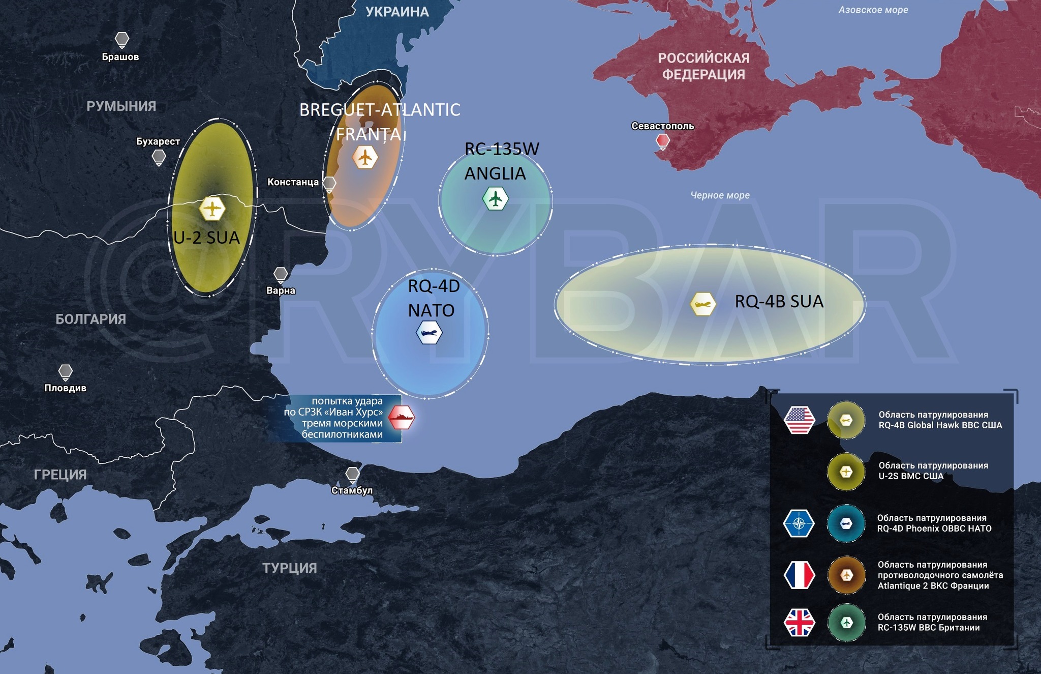 Imediat după atacarea navei rusești Ivan Khurs, de 3 drone navale, 5 avioane de recunoaștere ale Forțelor Aeriene ale SUA și ale țărilor NATO au apărut deasupra mării Negre. Misiunea lor : de a monitoriza mișcările navelor și aeronavelor flotei ruse a mării Negre și a indica ucrainienilor țintele. Ca o coincidență, odată cu venirea nopții, 7 UAV-uri Mugin-5, încărcate fiecare cu 25 kg de explozibil au decolat de la Odesa.