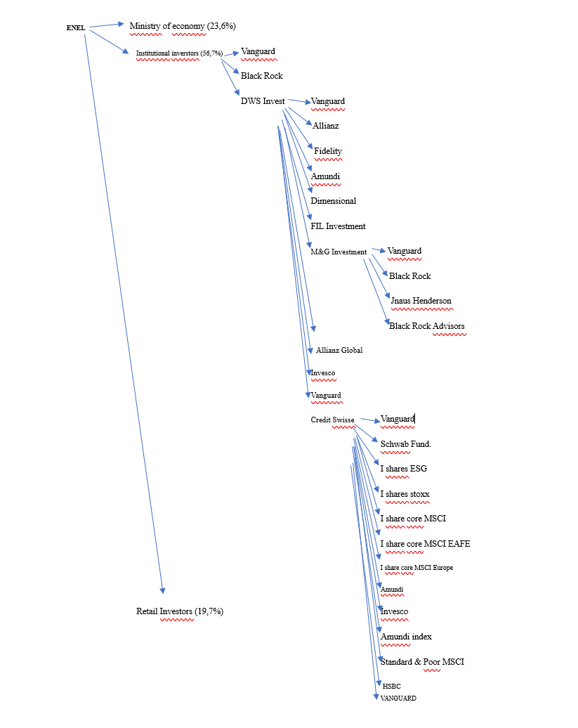 Graficul de mai jos reprezintă rezultatul investigațiilor referitoare la acționarii văzuți și mai puțin vizibili ai companiei ENEL.