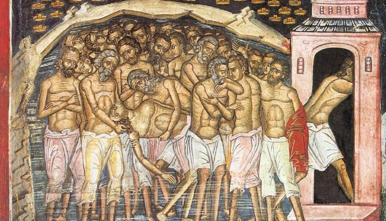 Atunci voievodul, împreună cu Lisie, au poruncit ca pe toţi sfinţii patruzeci de mucenici să-i ducă legaţi la iezer; că era un iezer lângă cetatea Sevastiei, care avea apă multă. Răbdând vitejeşte cele de aici şi bucurându-se de cele nădăjduite, sfinţii mucenici grăiau unul către altul: „Nu de haine ne dezbrăcăm, ci pe omul cel vechi lepădăm; aspră este iarnă, dar dulce este Raiul; iute este gerul, dar plăcută este desfătarea. Pentru Raiul pe care l-am pierdut să nu mai răbdăm astăzi pe noi haina cea stricăcioasă. Să defăimăm gheaţa care ne topeşte şi să urâm trupul.